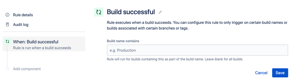 Rule executes when a build succeeds. You can configure this rule to only trigger on certain build names or builds associated with certain branches or tags.